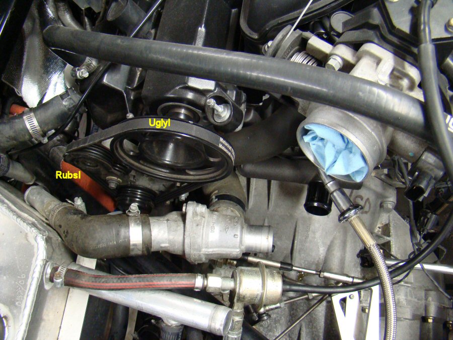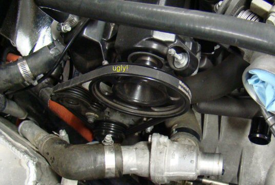 I think the engine bay of a supercar should look good. This factory water pump design looks like an ugly afterthought. Plus, the tensioner pulley really wanted to cut the shifter cables in half. This monstrosity had to go!