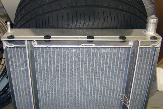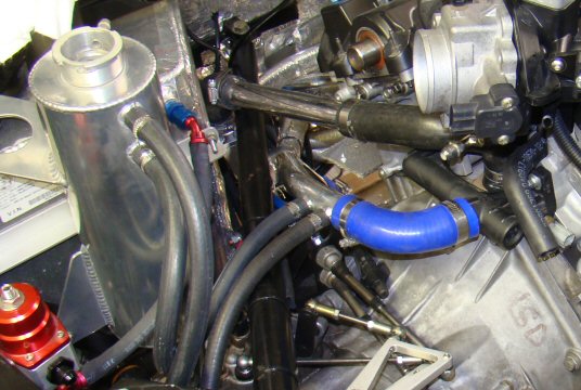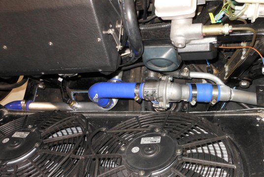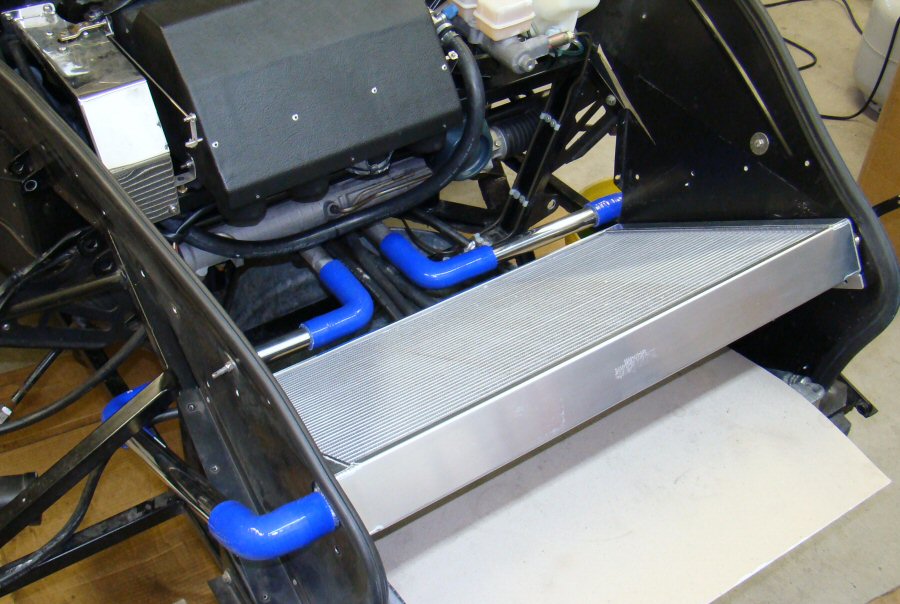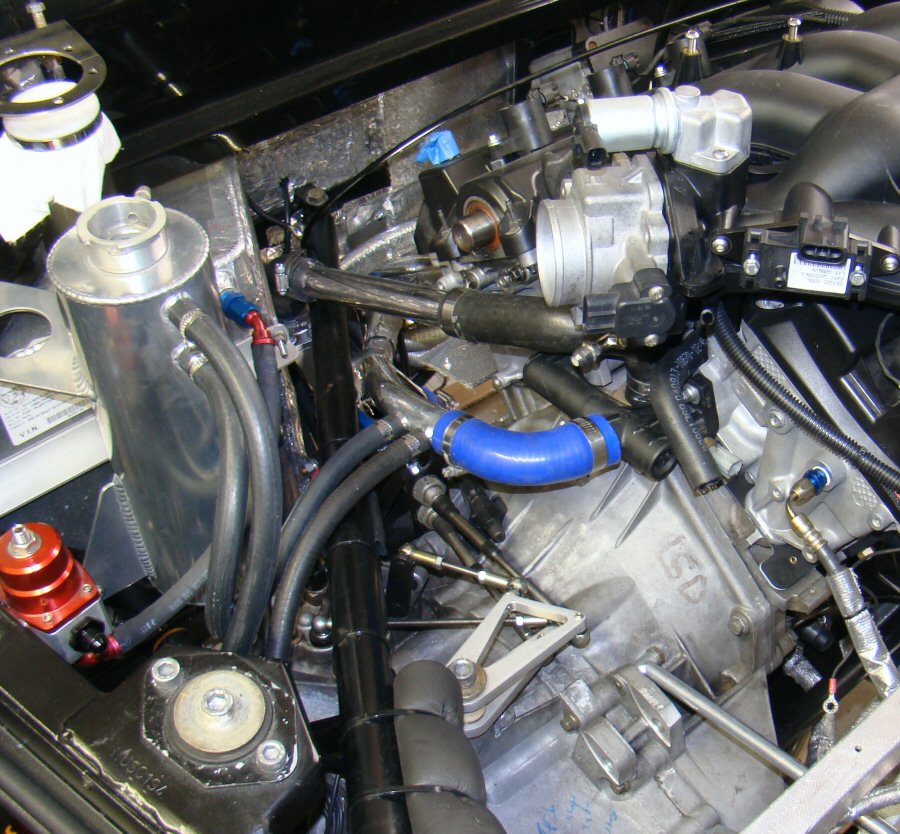 The Ron Davis radiator is just a nudge thicker than the factory part, so it is not clear whether it makes a measureable difference. The blue silicone hoses clearly do not make a measurable difference, but they look nice. Supercars should look good in addition to scaring the snot out of you. Obviously, this picture was taken before the electric water pump went in.
