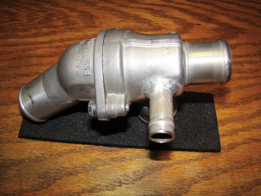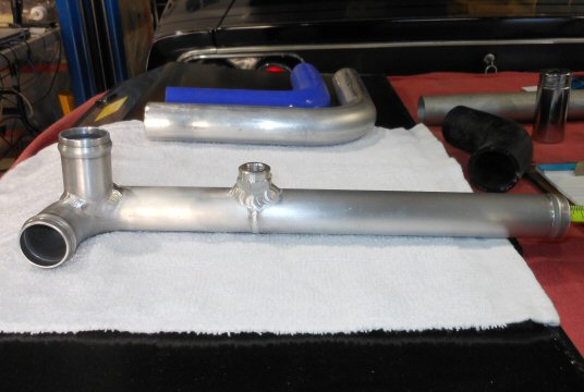 Here's another piece that Craig Hill built for me. The bung is for the temperature sensor used by the electric pump controller to vary pump speed. Cold water? Pump runs slowly. Hot water? Pump runs at full speed. This helps the engine warm up faster, and prolongs pump life.