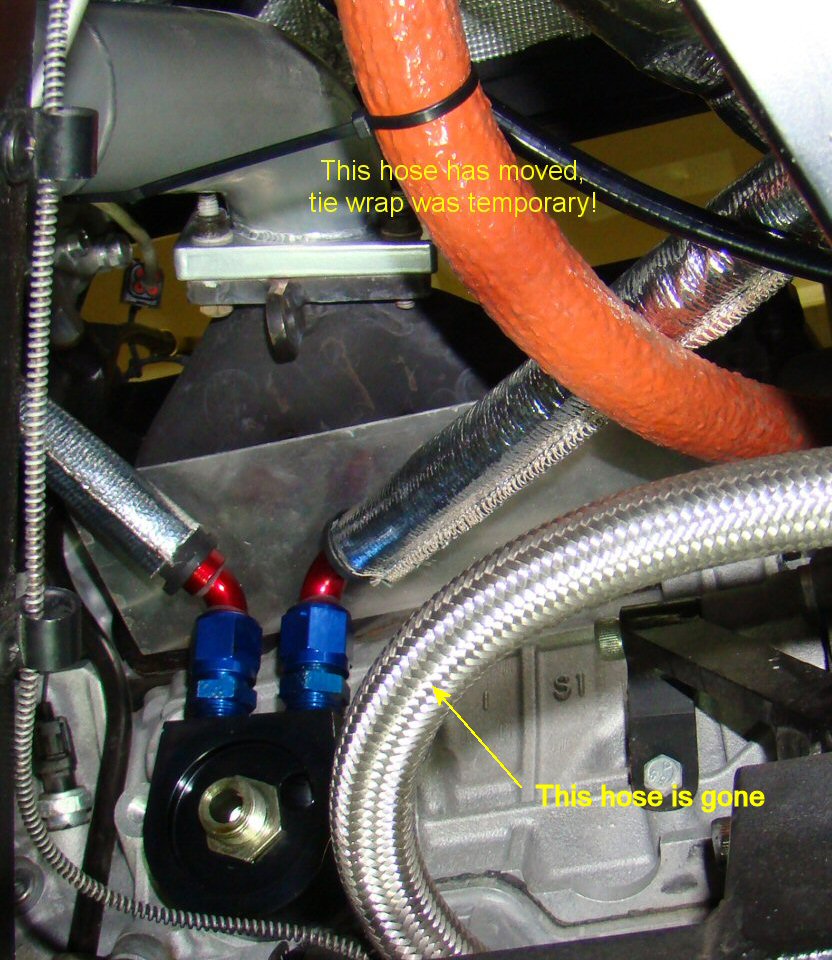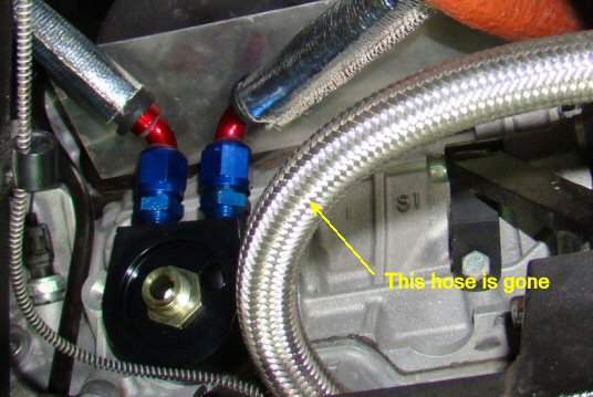 This shot shows the adapter that provides oil inlet and outlet for the Laminova cooler. The prominent braided stainless hose was a factory fuel line that is no longer there. The upgraded fuel system is covered on another page.