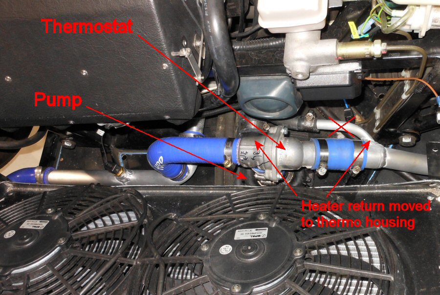 My solution was a Davies Craig electric pump mounted on the belly pan between the front tires. The thermostat housing seen in the first picture was relocated to the pump inlet as shown above. Also shown above is the temperature sensor that the pump controller uses to vary pump speed.