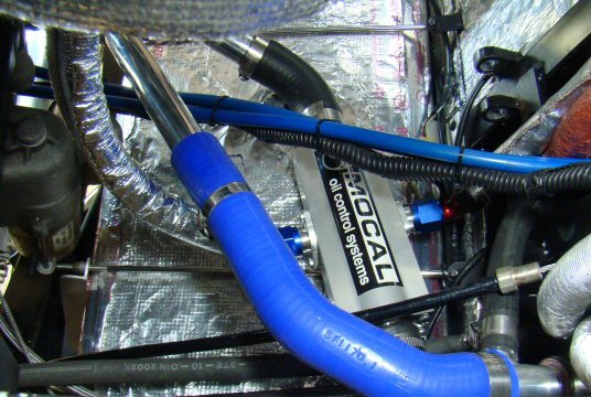 My Noble came with an air/oil oil cooler mounted behind the scoop that is behind the right side door. Noble aero is not the best, and that location does not get a lot of air flow. I decided on a Laminova water/oil oil cooler. This approach provides the added benefit of warming up cold oil more quickly. The cooler is on the cold water side of the radiator system.